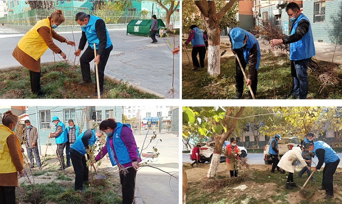 为保障树苗栽植效果和成活率,懂得专业技术的居民党员艾合买提·阿合尼亚孜特意到活动现场,为志愿者们详细讲解植树技巧,现场示范技术要领,大家认真聆听、心领神会。