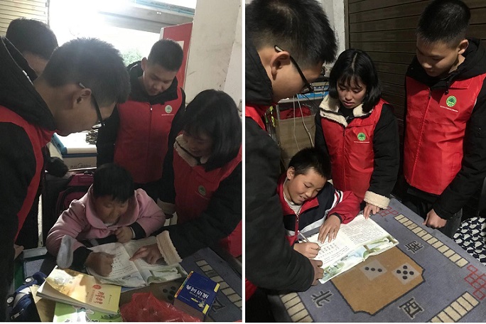 一大早,志愿者们就在教学楼前坪集合,与残疾儿童见面,和他们一起交谈分享等,表演一些文娱节目,然后由孩子们带领志愿者们去见他们家长,一路给他们讲讲故事、谈谈心,充满了欢声笑语。