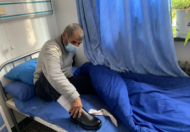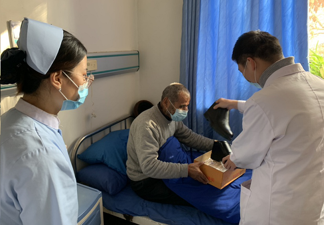 12月17日,沙雅县人民医院眼耳鼻喉科一名住院患者在住院期间鞋底断裂,该患者没有可以穿的鞋,用塑料袋裹着脚行走,主管医生了解到该患者为“三无”人员,为该患者购买了一双棉鞋,收到鞋子后,患者脸上洋溢着幸福的笑容,嘴里不停的说着感谢话语,这感人的一幕见证了医者大爱、人间温暖。在沙雅县人民医院眼耳鼻喉科医护人员的帮助和治疗照料下,患者顺利康复出院。