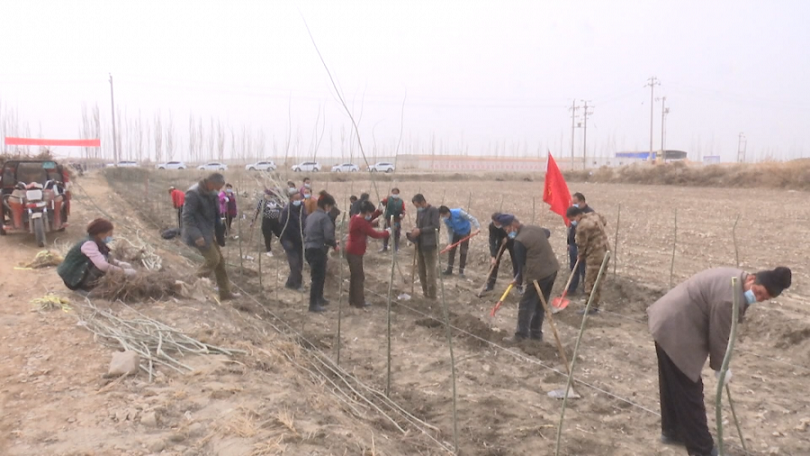 3月14日,在沙雅县古勒巴格镇奥吐拉库勒达西村的植树造林现场,党员干部们纷纷拿起铁锹挖坑植苗、铲土入坑、培实新土,活动现场一派热火朝天的劳动景象,一会工夫,连片的树木整齐有致,迎风挺立,原本空地上出现了一排排树木。