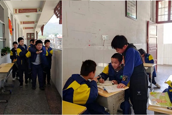 上厕所是陈同学的一大难事,平时默不作声、身材高大的王昌旺同学和调皮的杨旭东同学总是争着俯下身子背着他去厕所。肖辉灿、杨凯、兰亚杰等同学就扶的扶身子,搬的搬凳子(因为他上厕所时必须要双手扶着凳子)。