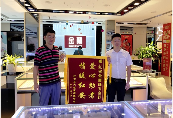 清风网讯(红安县大赵家高中:郑传兴)6月12日,红安县大赵家高中负责人一行将“爱心助考 情暖红安”的锦旗送到红安金兰珠宝金行,表达对金兰金行在高考期间无私助考公益活动的感激之情。