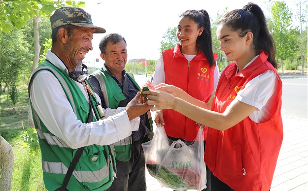 7月29日,新疆库车市东城街道新天地社区党员志愿者为环卫工人送西瓜解暑。连日来,该社区组织党员志愿者开展“我为群众,情系一线”送清凉活动,为冒高温、战酷暑,奋战在美化城市一线的环卫工人送去夏日的清凉。