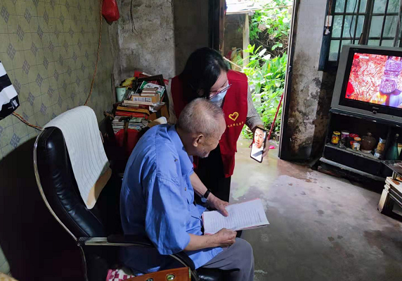 “爷爷,您最近身体好吗?”“孩子,我很好,在外面要照顾好自己,只要你们平安健康,我就幸福快乐!”8月17日,在瑞昌市码头镇西街社区,91岁老人谭家如正通过志愿者的手机和在九江工作的孙子进行视频电话,老人脸上洋溢着幸福的笑容。