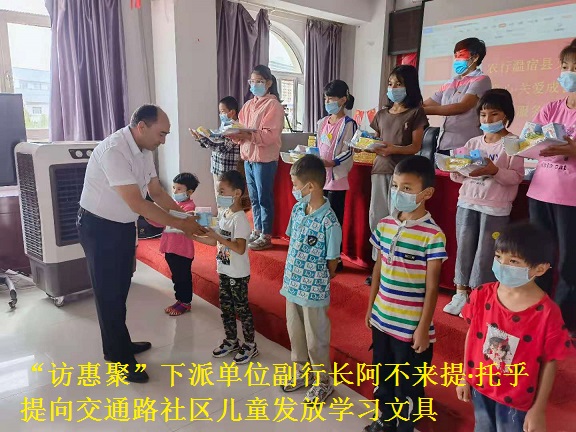 此次下派单位农行领导对社区儿童赠送学习用品,让社区群众深刻感受到了党的温暖与关怀。(农行温宿县支行驻温宿镇交通路社区“访惠聚”工作队 第一书记:彭丽丽)