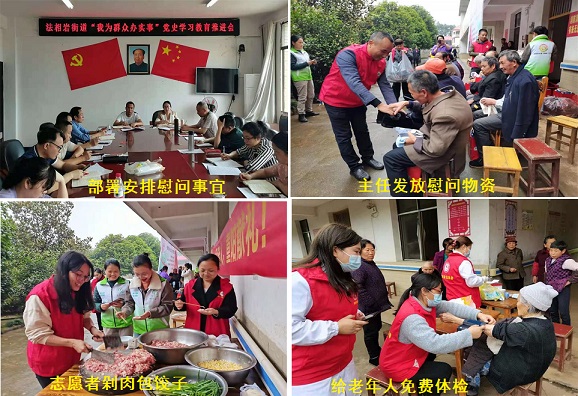 为大力弘扬和传承传统敬老文化,今年武冈市法相岩街道将老年人特别是困难(孤寡)老人作为党史学习教育“我为群众办实事”来抓,主要负责人亲力亲为,其他班子成员分工又协作,团结带领机关、部门等162名党员干部下沉到17个村(社区)老人家庭。从关爱安乐敬老院24名老人家出发,从增加老年人获得感、幸福感、快乐感落地,通过开展敬老、爱老、助老、孝老、乐老等一系列惠老活动,从生产、生活一直延伸到身体健康,让他们更强地感受到党和政府带来的温暖如春,让他们更多地享受到脱贫攻坚带来的丰硕成果,让他们更好地享受到乡村振兴带来的小康生活。