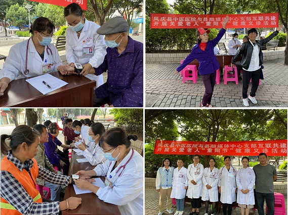 为扎实有效推进党史学习教育,丰富庆祝建党百年活动形式,弘扬中华民族尊老、爱老、敬老的传统美德,10月14日上午8:30,在文明社区街心花园,凤庆县中医医院与县融媒体中心支部互联共建开展关爱老人“重阳节”健康义诊活动,县中医医院选派临床科室4名党员专家,行政科室3名党员志愿者,县融媒体中心选派2名党员志愿者,为群众提供免费测量血压、健康咨询、医保政策宣传、诊疗服务。