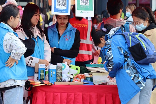 恰逢周末,不少湖州市民来到广场。以舞台为中心,我院青年志愿者协会的义卖摊位设立在此,由学院同学们募捐的闲置物品被整齐地罗列在摊位前。随着游人们拿着小玩偶、雨衣、书本、图册离开,众人的心意也由这一个个小物件汇聚,募捐箱中集满湖州人跃动的爱心。