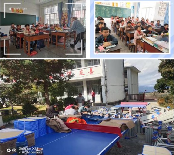 师生一起把桌椅搬进了教室。孩子们终于坐上了新桌椅,大家都很开心激动。