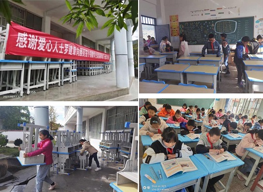 2021年10月,爱心人士罗建章再一次购买了110套桌椅,捐赠给腰街完小。