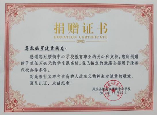清风网讯(通讯员:郑娟)2021年6月至2021年10月,腰街乡复兴村罗建章同志从老师那了解到学校情况后慷慨解囊,先后两次捐赠了价值伍万余元的学生课桌椅。生于农村的他,一直关注农村教育事业的发展及孩子的健康成长,始终以爱心回馈社会。