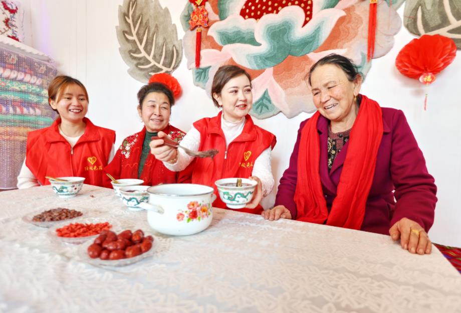 1月7日,新疆库车市委办公室驻依西哈拉镇玉斯屯村工作队队员给空巢老人盛腊八粥。腊八节将至,该市组织各级党员干部开展“腊八到 粥飘香”送温暖活动,为空巢老人、环卫工人等群体送去温暖和节日的祝福。