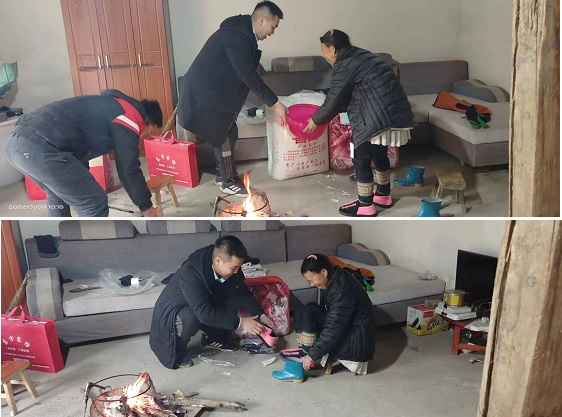 “滚奶,来,你快坐下,试一下这双鞋合不合脚,不合的话,我们再去换一对合脚的鞋来,来把这只脚放进来…”在滚老两老人家里,蒋国军蹲在地上给老人换上新买的棉鞋,合脚的棉鞋温暖着老人的双脚,老人脸上洋溢着幸福的笑容,感谢地说道:“谢谢你们啊,一有时间就来看我,每次来都送东西来,真的非常感谢你们。”随后,蒋国军和老人一起拉家常,帮助其打扫室内室外、房前屋后卫生。
