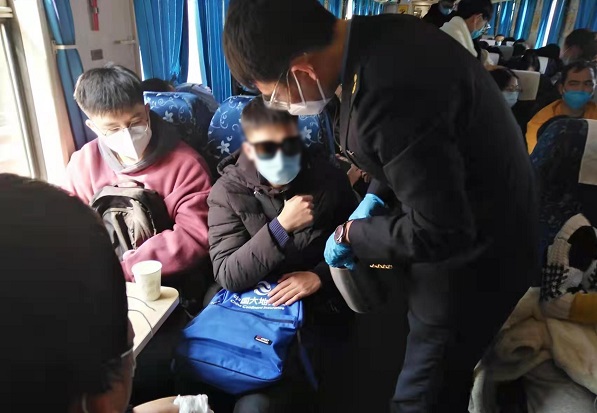春运最后一日,K9241次列车到达龙川火车站时,乘警长游战站台立岗时,发现一名戴着墨镜的旅客黄某正在寻求帮助。当乘警长发现他患有严重的视力障碍时,立即和列车工作人员将他扶上车。