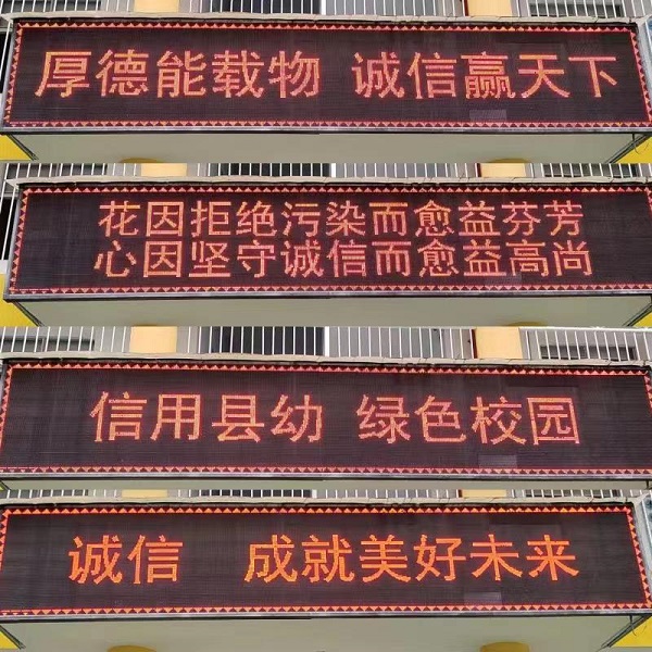 该园根据幼儿年龄特点组织开展了丰富多彩的诚信主题教育活动:大班用看视频短片、讲诚信故事给予幼儿正确的引导,向孩子们讲述什么是诚信,怎样做一个诚实的好孩子;中班以儿歌表演等形式,在欢快的音乐、朗朗上口的儿歌声、生动的肢体语言中,让孩子们在轻松愉悦的渲染下将诚信牢记于心;小班通过情境表演,亲身体验到诚信能给人带来快乐,诚信能让人拥有真心朋友 。同时为提升师幼的整体文明素养,通过电子显示屏播放宣传标语来营造诚实、守信的育人环境;充分发挥道德讲堂主阵地作用,通过唱诚信歌曲、讲诚信故事、谈感悟、作诚信承诺等环节来增强全体教职工诚信意识,为身边的家长、幼儿时时处处传递守信正能量。