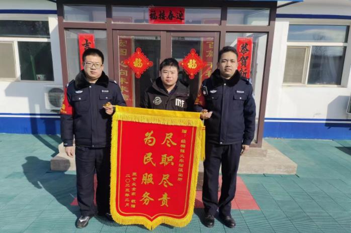 2月22日下午,王大爷的儿子来到经棚车站派出所,送来一面写着“为民服务 尽职尽责”的锦旗,对民警的帮助表示感谢。(通讯员 付彦隆、郭明珠)