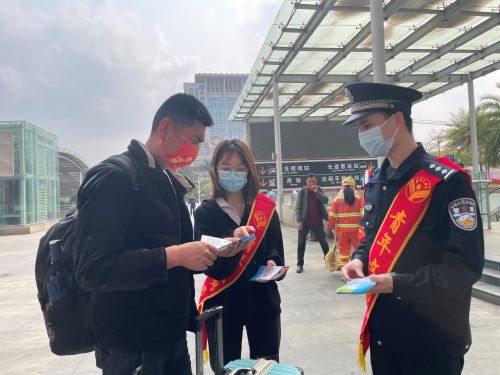 活动现场,在海口东站广场设置宣传展台,民警及大学生志愿者以发放宣传资料、现场讲解等形式,为往来旅客宣讲反诈、防骗、禁毒等知识,热心为旅客解答铁路相关法律法规知识,并深入车站广场、进站口、候车室,主动为旅客提供答疑解惑、拎包指路、帮扶上车等出行服务,着力营造温馨、舒适、安全的乘降环境,受到了往来旅客一致好评。期间,共发放宣传资料2000余份,宣传旅客群众5000余人,提供咨询引导130余次,帮助旅客解决困难80余件。(通讯员:陈丽)
