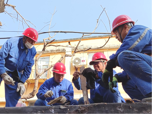 正值春季大风天较多,西山生活区有一棵大型杨树枯死,存在树木倒伏和断枝坠落的安全隐患。3月8日中午,大家利用中午午休行人较少的有利时段,组织志愿服务队对枯树进行伐除。因枯树紧贴居民楼,周边电线围绕给伐除工作带来了极大困难及危险性,绿化队技术骨干张云、吴立军同志身前士卒、冲锋在前,尤其是五十二岁的吴立军同志主动请缨进行高空作业,采取对枯枝小段截除伐法,进行伐除。时间紧、任务重,不仅要保证作业安全,更要保证职工正常上班。待枯树落地后,所有人员快速截杆,队员们带着一上午劳动的疲劳,不顾饥饿,枯枝清理共计三车,做到工完、料尽、场地清。为广大职工群众营造“畅、安、舒、美”的安居环境。