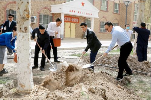 4月25日下午,在第一师医院援友之家(援疆馆)门前,党委书记管永虎,党委副书记、院长陈大进,邀请浙江大学医学院附属浙江医院党委书记陈军为第一师医院“援友林”植树、挂牌。