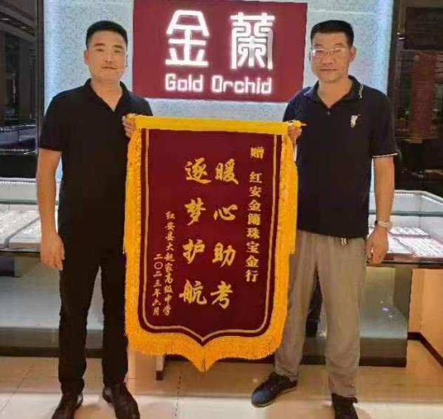 7月5日,红安县大赵家高中校长涂茂松一行将“暖心助考,逐梦护航”的锦旗送到红安金兰珠宝金行,表达对金兰金行在高考期间无私助考公益活动的感激之情。
