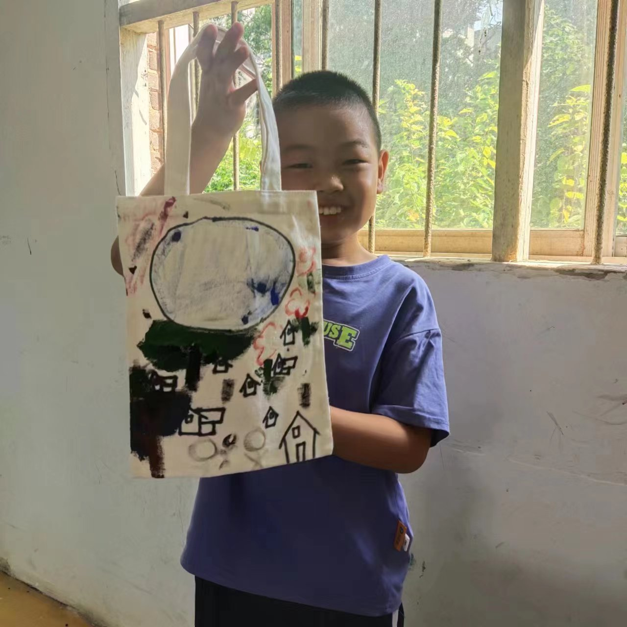 (图为小朋友展示涂鸦帆布袋作品)