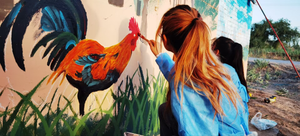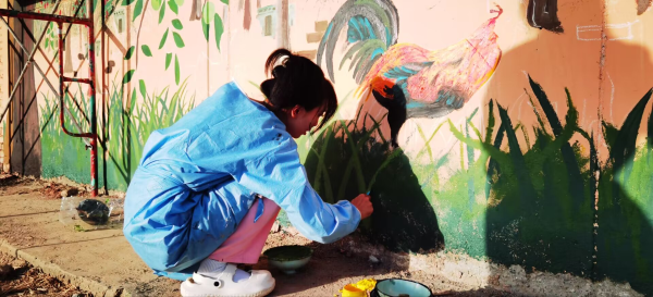 据了解,九团四连从去年开始和塔里木职业技术学院合作,共同打造具有连队特色的手绘文化墙,为红顶黄墙增添一抹亮色。在这十天内,志愿者们分工合作,夜晚描线、白天调色上色,为朴素的砖墙穿上了美丽的“外衣”。这些墙绘既体现出“党建引领”的中心思想,又反映了“林下种植、养殖”的连队特色。