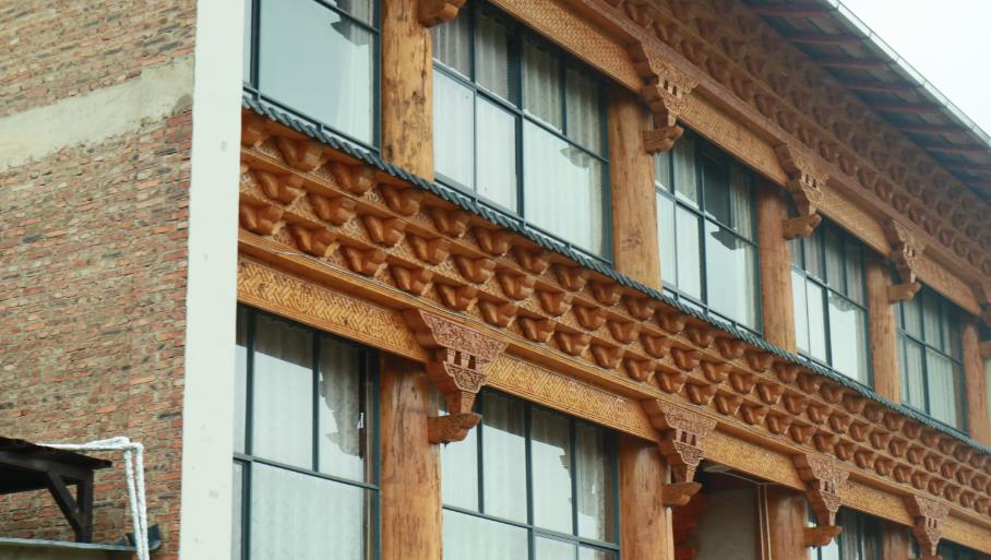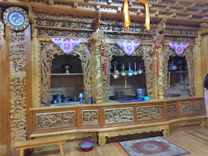 随后,团队在非遗传承人扎西尼玛和当地居民的代领下,进入当地藏房参观。成员们纷纷被精美的木雕震撼,不仅是房子的外部房檐,大厅内部也刻满了精致的图案。扎西尼玛向团队介绍到,最早的藏房只在外部刻有藏雕,随着时代发展,许多居民会在房间内部装修和家具之中加入木雕,部分木雕也会添加一些彩绘。这是对藏雕进行的一种创新。