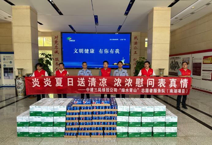 为彰显央企社会责任,7月27日上午,中建三局绿投公司“绿水青山”志愿者服务队(南湖项目)走进东湖高新区交通大队,带来矿泉水、饮料等防暑降温物资,为坚守在执勤一线的交警送去夏日的“清凉”。