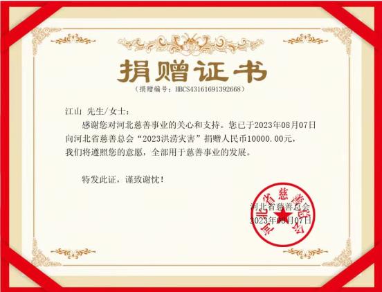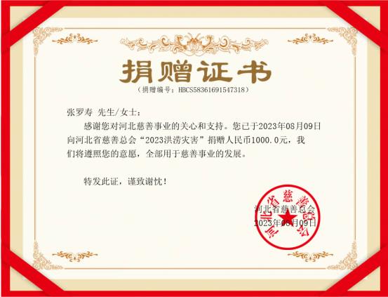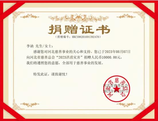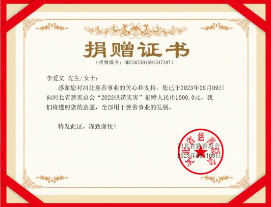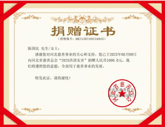 参加座谈会的毛主席警卫陈国民,听说要为自己的家乡河北受灾群众捐款,欣然提笔题字:“向河北人民学习,向河北人民致致敬!” 在“向河北人民学习,向河北人民致致敬!”题字上签名的有:毛泽东主席女儿李讷、周恩来总理侄女周秉宜、朱德委员长孙女朱新华、胡永丰少将、中红网总编辑江山、北京百年风云文化艺术中心法定代表人方月、毛主席警卫陈国民、李耿成。8月8日下午,中红网总编辑江山将签名题字和捐款送到河北省人民政府驻北京办事处,河北驻京办机关工作人员对此表示感谢和赞扬。“河北省慈善总会”向李讷、周秉宜、朱新华、陈国民、胡永丰、李爱文、江山、张罗寿颁发了《捐赠证书》。毛主席、周总理和朱委员长亲属热情地为河北遭受洪涝灾害干部群众捐款之举,受到一些知情者的称赞。一位中年妇女说:“我知道李讷的家庭情况,她年纪大了,身体又有病,请了两位保姆,家庭负担可不轻啊!”