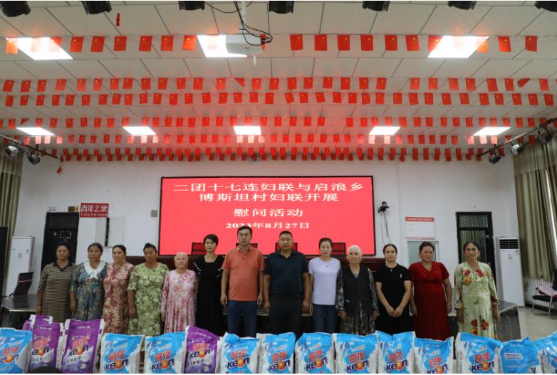 8月27日,新疆生产建设兵团第一师二团十七连妇联走进结对共建的柯坪县启浪乡博斯坦村,开展走访慰问活动,给妇女和儿童送上价值1.5万元的生活用品和学习用品,促进连村结对共建向纵深发展。