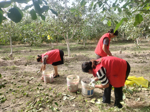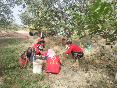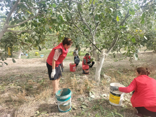 走进村民买买提·巴拉提的核桃林里,头顶烈日,大家分工有序,齐心协力,有的提着桶,有的拿着麻袋捡核桃,大家有说有笑,拉着家常,听着群众的生产生活情况,畅谈生活新变化,同时普及党的惠民政策,在核桃树下,呈现出了一派忙碌热闹的景象。