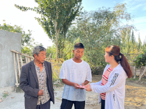 9月10日早上十点,祖里亚尔·尤勒瓦斯就要出发去库车上学,在十点之前,温宿县妇幼保健院驻阿热勒镇尤喀克麦盖提村工作队第一书记刘文带领工作队员前往其家中将工作队自发微薄的捐款送到其手上,并将其送上前往温宿的大巴车上。“到了学校一定要好好学习技术,要照顾好自己,虽然钱不多,但是这是全体工作队员的一点心意,暂时够这两个月生活费了,有事情联系我们,后面我们还会想办法的继续关注你,最近核桃、棉花都开始收获了,我们也会引导、督促好你爸爸的,让他少喝酒帮助他外出务工多赚钱,供你上学的。”