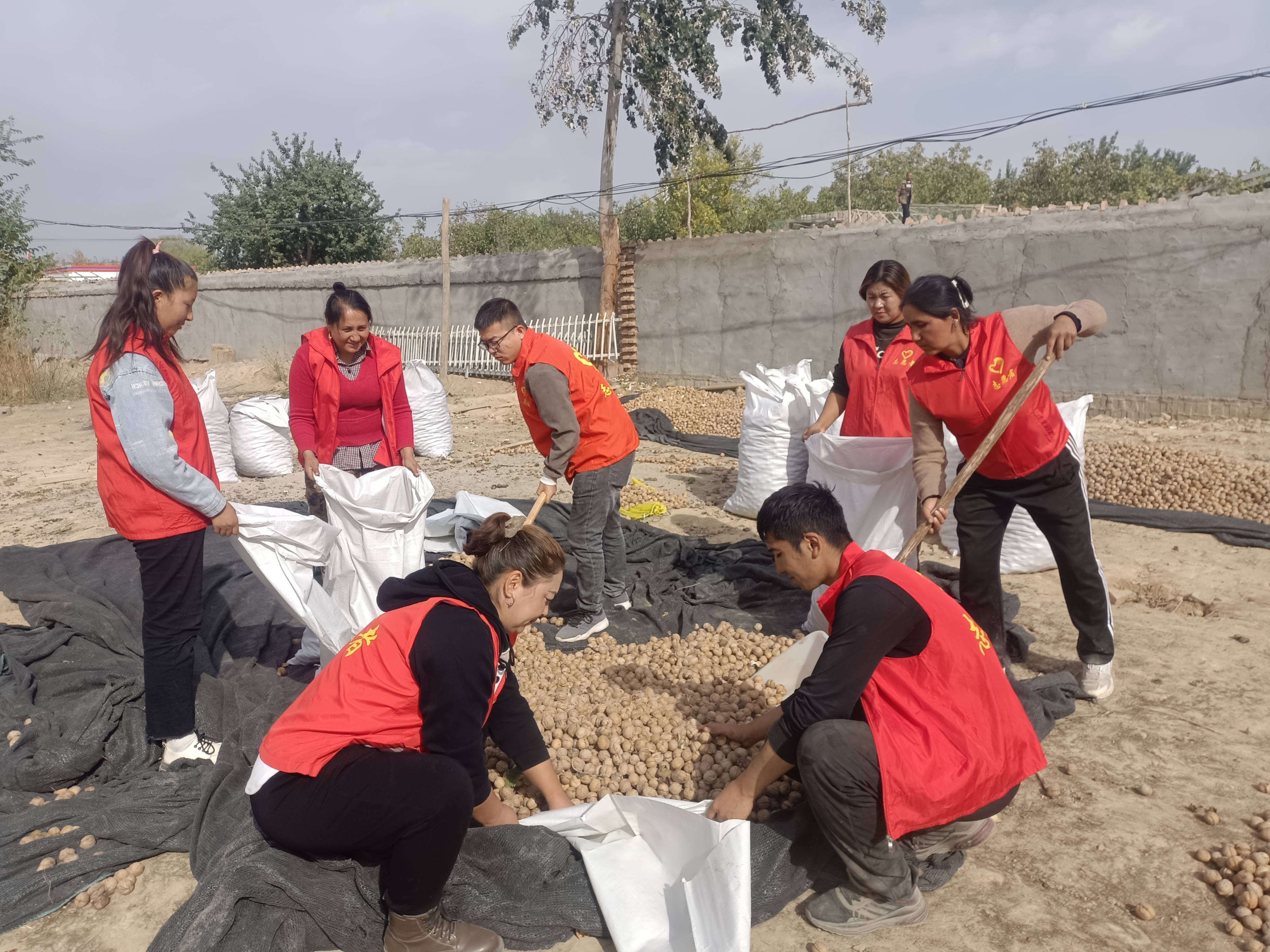 帕万拉村二组塔依尔·吐尔洪家劳动力少,帕万拉村新时代文明实践站立即组织农民党员、村干部和驻村工作队干部参与帮扶活动,帮助塔依尔·吐尔洪家将核桃装起来。活动中,志愿者们个个都是热情高涨,挽起袖子、挥舞着铁锹,卖力的装核桃,在大家齐心协力,团结一致的努力下,不一会儿功夫已经装的差不多了,虽然汗珠从额头滴滴落下,但看着自己的劳动成果,志愿者们脸上都洋溢着幸福的笑容。此次活动加深了干部和群众之间的感情,更让广大群众切实感受到了党和政府的关心关爱。