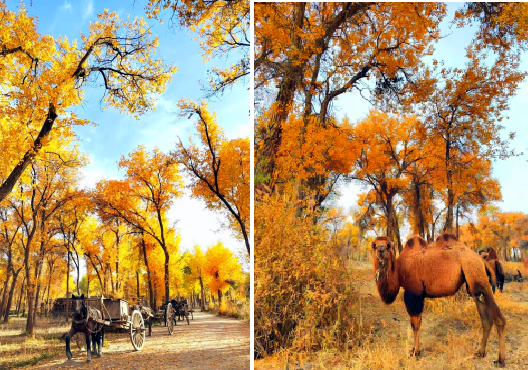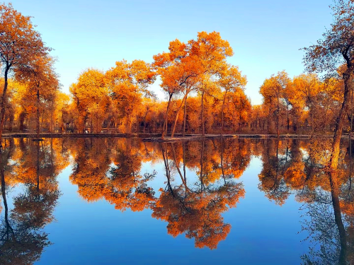 金秋十月,新疆维吾尔自治区阿克苏地区阿瓦提县的胡杨林迎来最美的时节,繁盛烂漫,色彩绚烂,绝美景观,吸引众多游客前来打卡。(包良廷:摄影)