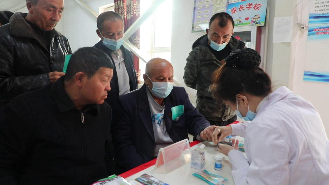 库车市民族团结进步促进会专职干部买热哈巴·艾则孜说:“今天我们援惠医院安排了内科、中医科、口腔科等医务人员,给村民做测血压、测血糖、检查心电图、检查口腔疾病等服务,并进行疾病预防和医药知识讲解,让村民了解他们的身体情况,提高他们的健康意识,同时营造全民健康生活的浓厚氛围。”