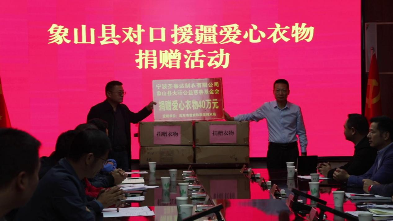 座谈会上,由宁波圣事达制衣有限公司和象山县大旸公益慈善基金会共同为库车当地学生捐赠了价值40余万元、4300多件棉衣棉裤,帮助库车市小朋友更好地过冬御寒,深刻体会爱心奉献的意义,感受社会各界的温暖和关怀,同时激励宁波援疆干部更好地做好对口援疆工作。