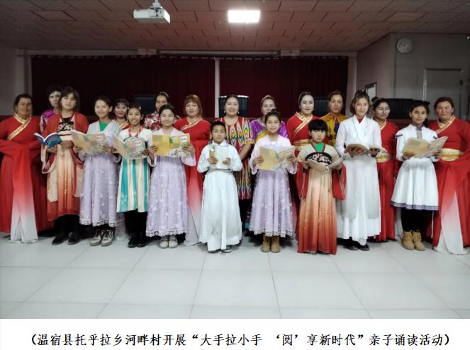阿克苏地委史志办驻温宿县托乎拉乡河畔村工作队、村党支部通过“大手拉小手”,开展主题突出,特色鲜明,形式多样、内涵丰富的经典诵读,教育引导青少年读经典、学经典,爱经典,用传统经典增强文化自信,用红色经典激发爱国情感,用当代经典树立远大理想。今年以来,共组织开展“大手拉小手”亲子诵读8次。