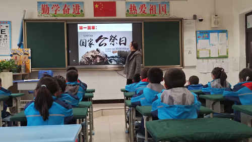 升旗仪式开始,雄壮的国歌响起,鲜艳的五星红旗冉冉升起。全体学生高唱国歌,凝视五星红旗,目光坚毅,向国旗敬礼。七(1)班学生代表做国旗下讲话,讲到“我们要牢固树立爱国精神。作为新一代中小学生,我们目光所及皆为华夏,心中所想皆为志向。”各班开展主题班会,各班主任老师讲解了国家公祭日相关知识,什么是国家公祭日?国家公祭日的意义是什么?作为新时代少年儿童应该怎么做?红色教育的渗透,增强了学生铭记历史、吾辈自强的思想意识。
