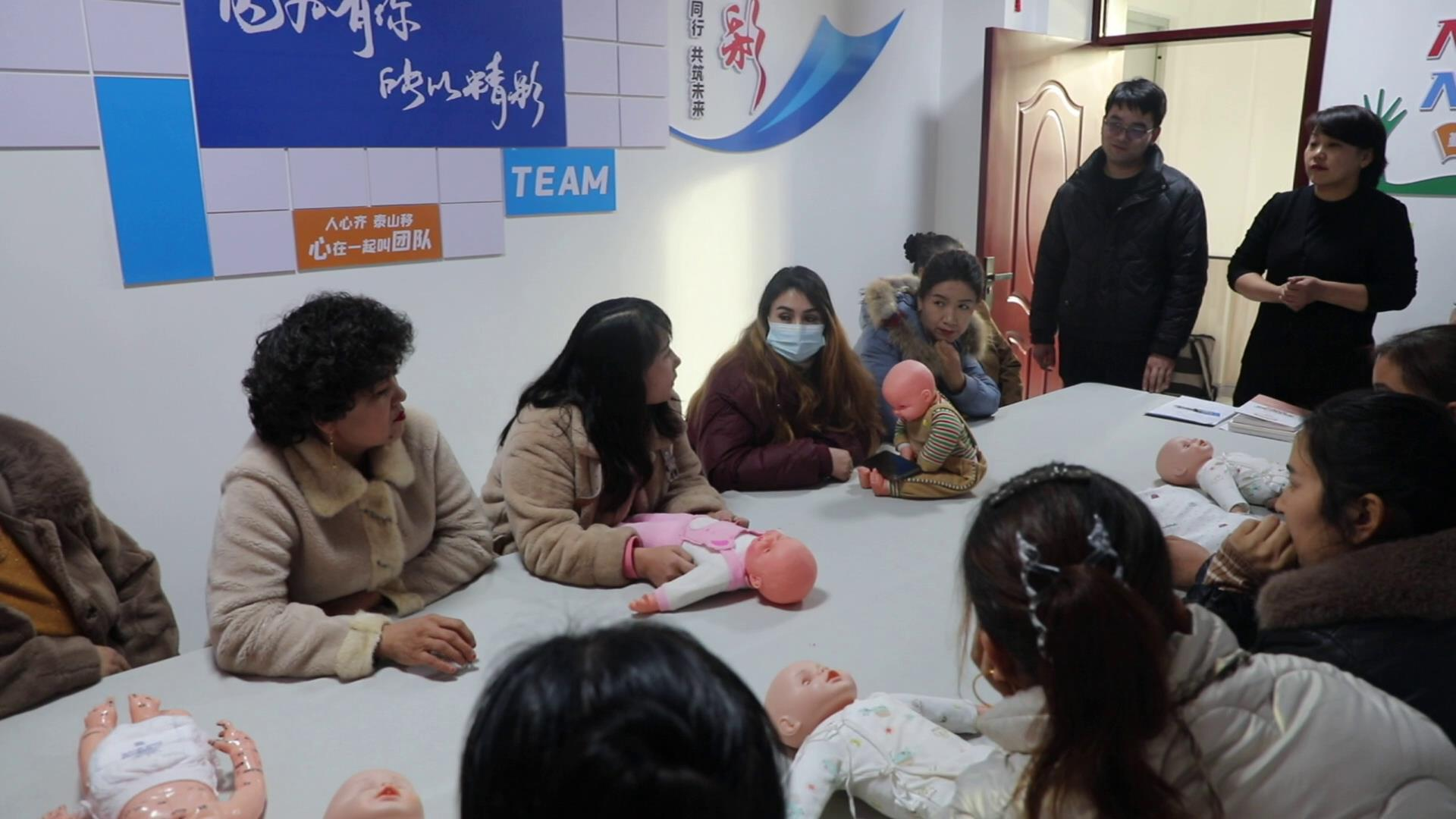 在库车市禧源社区日间照料中心,库车安亿家政服务有限公司总经理吕凤莲正在为社区内有意向工作的妇女们开展婴幼儿护理培训,她一边传授相关技巧,一边指导学员实践,并带领学员进行实操演示。