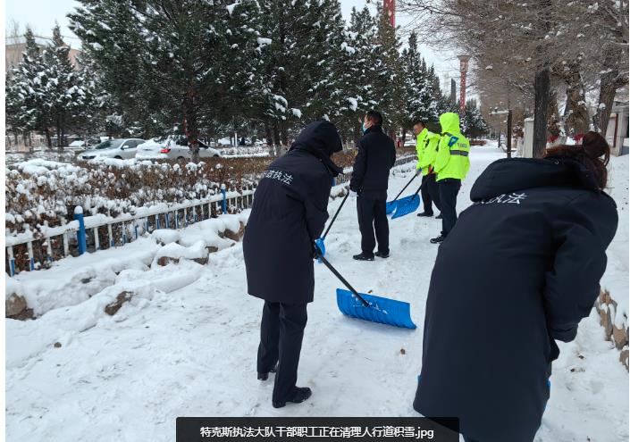 近期,特克斯县气温骤降,普降大雪,给城市居民群众正常出行带来诸多不便。为保障群众出行安全,特克斯执法大队以“雪”为令、闻“雪”而动,立即开展清雪活动,党员干部齐上阵清除单位大门外两侧人行道积雪,用实际行动为民服务、情暖民心。