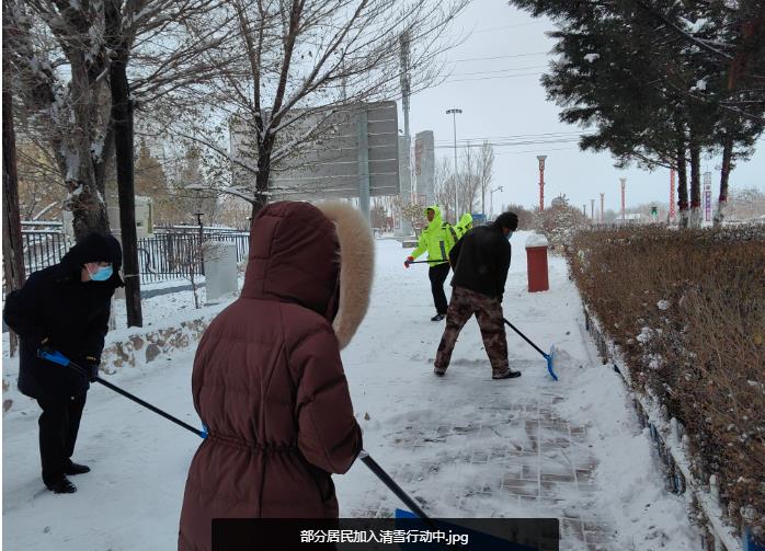 活动中,干部职工们积极响应,不畏严寒,不怕吃苦,大家你铲我推,齐心协力,干得热火朝天,即使脸冻的通红,也丝毫不减劳动热情,大家的这种奉献精神也带动了部分居民前来一起清雪,忙碌的身影构成冬日里一道亮丽的风景线。经过近2小时的奋战,路面的积雪情况得到缓解,为居民的生活与安全出行带来了便捷。