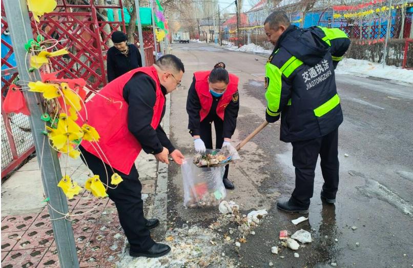 党员志愿者们主动亮明身份在社区的统一安排下,入街道、入网格、入庭院,带头示范,全力攻坚,切实将“学思想、强党性、重实践、建新功”落实到实际行动中,全力提升社区环境卫生水平,增强群众幸福感。志愿者们与社区人员一同看望孤寡老人,与老人聊聊家长里短,询问老人现在的生活状况,有无困难需要解决,并帮助老人打扫庭院卫生。随后深入社区街道开展卫生清理活动。他们手拿扫把、簸箕、拾捡器等清洁工具,随同网格员一起对街道两边的积雪结冰、绿化带里散落隐藏的垃圾、卫生死角进行了全面清理。大家齐心协力,个个精神饱满、热情高涨、干劲十足,充分发扬不怕苦、不怕脏、不怕累的优良作风。在志愿者的共同努力下,社区环境焕然一新,卫生状况得到明显改善。