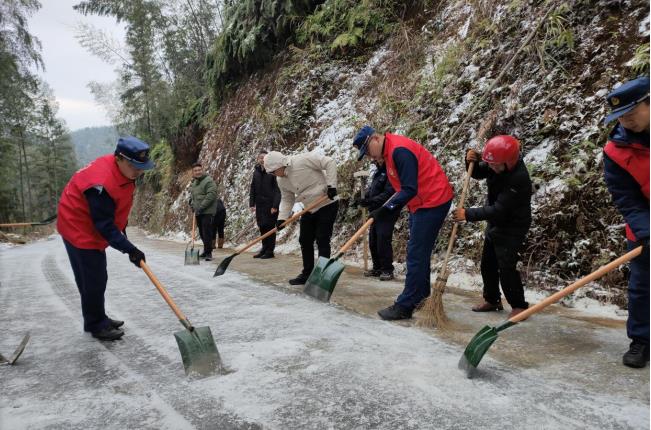 在樟斗镇,青年突击队队员顶着风雪,对圩镇周边道路、桥梁进行积雪清理作业,大家齐心协力,分工明确,高效配合,全力清除路面上的积雪,及时为车辆和行人清理出一条条“安全路”。
