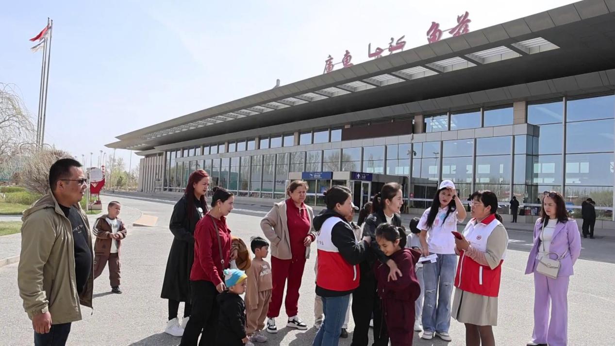 4月9日,新疆库车市今年首批11名患儿及其家长在市红十字会工作人员的陪同下在库车龟兹机场正有序办理登记手续,准备搭乘当日14:05的航班前往北京接受免费手术。