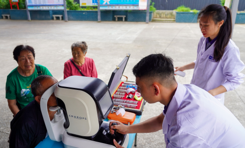 2024年6月6日,志愿者在贵州省从江县丙梅街道免费给群众进行免费检查,普及眼保健知识。