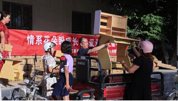6月20日,在库车市阿拉哈格镇央都玛村委会广场,一张张承载着智慧的书桌,被工人们有条不絮的组装着,安装零件、固定装置,搬运书桌……孩子们也围着已组装好的书桌好奇的看着,很快色泽鲜艳、台面崭新、符合人体力学的爱心书桌在自治区人社厅驻村工作队员的帮助下搬进了央都玛村困难儿童家中。