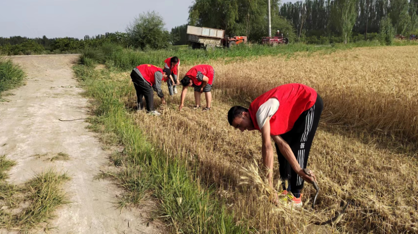 麦田里机器轰鸣,志愿者协助村民捡起遗漏、装车,大家分工明确,收获的喜悦洋溢在心头。在劳动过程中志愿者们,发扬了不怕苦、不怕累的精神,他们埋头苦干,切实解决了群众的后顾之忧。收割完毕后,大家坐在一起进行了交流,村党支部书记吐尔逊江·肉孜向大家讲解了麦收期间的农机安全知识,宣传了禁止就地焚烧麦梗等防火常识。