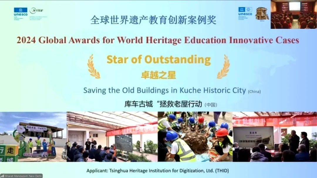 当地时间7月23日13:30,在印度新德里举行的第46届世界遗产大会“面向未来的世界遗产教育——科技、创意与赋能”主题边会上,现场揭晓了全球世界遗产教育创新案例奖(AWHEIC)获奖名单,经过激烈的角逐,库车“拯救老屋行动”案例在本次参赛的100多个案例中脱颖而出,荣获2024年“全球世界遗产教育创新案例-卓越之星”奖,并作为优秀案例代表在会上进行了线上分享报告。