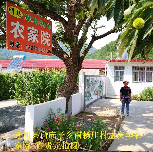 南杨庄村孟庆华一家,是响应白庙子乡号召兴办“农家乐”的第一个。村书记徐志满帮着跑前跑后、热情支持,并提出“体现山区资源特色、搞好拿手饭菜品种、注重庭院卫生质量和安全”,给孟庆华指明了办好“农家乐”的方向。孟庆华本是黑龙江齐齐哈尔农村嫁到南杨庄村的,今年40岁出头,膝下有两个女儿,一个上大学的,一个上初中的,丈夫在附近的铁厂打工,小日子过得和和美美。孟庆华是“农家乐”的老板娘。自去年6月正份式开张营业以来,游客络绎不绝。孟庆华以“家常菜”为主,品种有五六十个,拿手的大菜有“油炸香椿鱼”、“红烧猪肉”、“花椒肉”、“肘子”、“猪蹄”、“自制凉粉”、“炸千子”等。而且拒绝野味、守法经营、物美价廉、经济实惠。眼下炎热季节,随着游客增多,孟庆华的“农家乐”越来越火,到今年底,保守地地估计可盈利12万元。