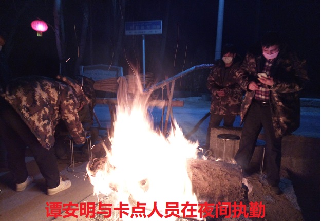 车来车往,例行疫情常规检查是疫情期间的非常举措,但部分过往村民却不予理解,认为自己健康,平时都认识,没必要例行检查。此时,在所难免就会有村民与执勤人员发生言语冲突,谭安明于是细心给村民解释例行疫情检查,利己利人。在卡点一呆就是12个小时以上,做的是重复一遍又一遍的例行疫情检查程序,天寒地冻,夜间为取暖在卡点旁升起的篝火,在寒夜间也显得单薄无助,但那一腔为民服务的热情犹如燃烧的柴火般赤城,抵御住了这个乍暖还寒的春夜。